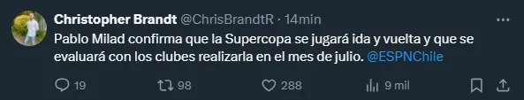 Hace unos instantes, el presidente de la ANFP, Pablo Milad confirmó que la Supercopa entre la Universidad de Chile y Colo Colo se terminará disputando en el mes de julio, en fechas que están por confirmarse, tras llegar a un acuerdo con ambos clubes.