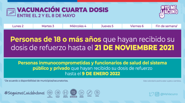 El proceso de vacunación sigue con las dosis de refuerzo y la cuarta dosis que se guían por un calendario de vacunación. La semana de este lunes 2 de mayo continuará el proceso de vacunación Covid-19 con las dosis de refuerzo y también con la cuarta dosis.