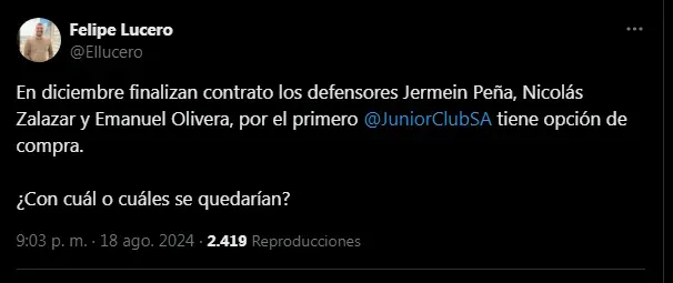 Además de Jermein Peña, los otros dos jugadores de la defensa del Junior con contratos que vencen en diciembre de 2024 son Nicolás Zalazar y Emanuel Olivera. Cabe destacar que estos dos últimos son extranjeros de origen argentino y veteranos con más experiencia que Peña.