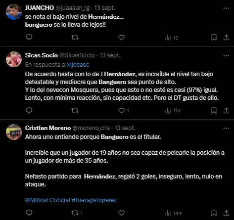 El festín lo comenzó Jesús Muñoz al minuto 38 y luego siguió Edwin Torres antes de finalizar el primer tiempo. Por si fuera poco, el central Mayorga expulsó a Sergio Mosquera, que vio la tarjeta roja tras la revisión del VAR por un fuerte golpe a un rival. Todo estaba saliendo mal desde los primeros 45 minutos y son varios los jugadores de Millonarios que son criticados.