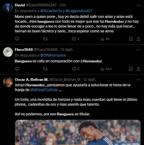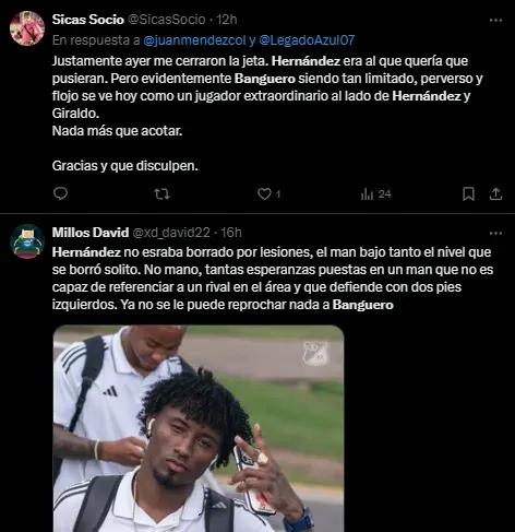 Son varios los jugadores que no quieren ver en Millonarios luego de lo que pasó en Valledupar. El lateral Joan Hernández merece un capítulo aparte, se le vio involucrado en el primer gol de Alianza y los hinchas mostraron su rechazo a su regreso, tras la recuperación por una grave lesión que lo saco algunos meses de la competencia. Prácticamente, en el ciclo con David González nunca estuvo.