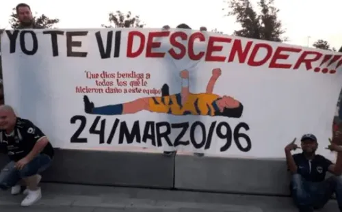 La misma muestra a un futbolista con la playera de Tigres tirado en el suelo, y es acompañado por el lema “yo te vi descender” y la fecha de aquel partido.
