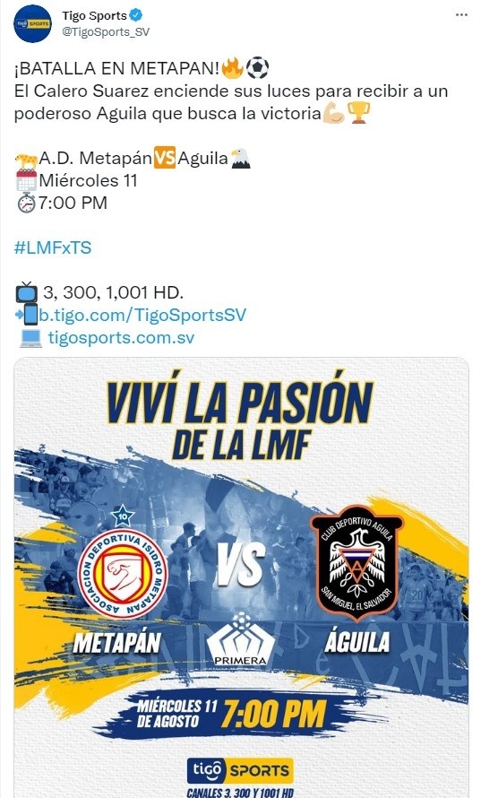 Dentro de lo que es la tercera jornada por la Liga de El Salvador,Isidro Metapánrecibe al plantel de Águilaen un duelo que se llevará a cabo HOY, miércoles 11de agosto. El juego será vibrante para los fanáticos de ambos equipos que esperan un buen choque y el cualserá transmitidoEN VIVO Y EN DIRECTOen la pantalla deTigo Sports 2desde las18:00 hora local.