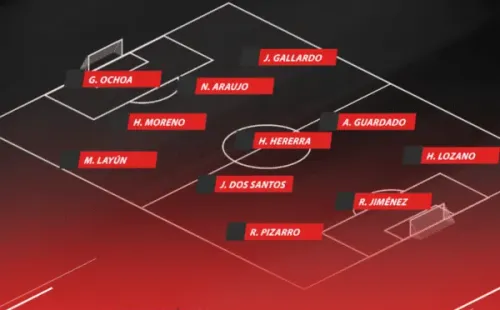 Guillermo Ochoa; Miguel Layún, Héctor Moreno, Néstor Araujo, Jesús Gallardo; Jonathan Dos Santos, Héctor Herrera, Andrés Guardado; Rodolfo Pizarro, Raúl Jiménez Hirving Lozano. Así sería nuestra alineación, siempre basándonos en el 4-3-3 que suele utilizar el Tata.