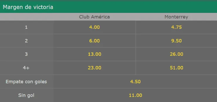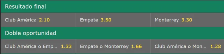 Con el análisis que nos entrega bet365, el favorito para vencer en este juego de ida de la final del Apertura de la Liga MX es América, cuyo triunfo paga 2.05 veces lo apostado. En tanto, si tienes la fe que Monterrey se llevará el primer encuentro, paga 3.40 veces lo apostado. Si eres de quienes piensa que terminará en los primeros 90 minutos con un empate, paga 3.50 veces lo jugado.