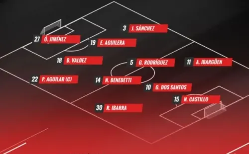 ¿Cuál es el mejor 11 que puede presentar América en este Apertura 2019? Formaría con Óscar Jiménez; Paul Aguilar, Bruno Valdez, Emanuel Aguilera, Jorge Sánchez; Nicolás Benedetti, Guido Rodríguez; Renato Ibarra, Giovani Dos Santos, Andrés Ibargüen; y Nicolás Castillo.
