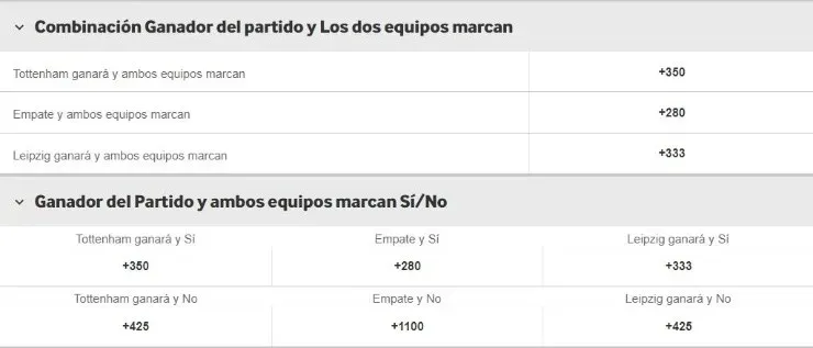Si te la quieres jugar con un resultado exacto, Betway te cuenta que si Tottenham gana por 1-0, el momio a pagar es de +900. Si crees que habrá empate 1-1, paga +500. Pero si crees que la sorpresa la dará RB Leipzig ganando por 1-2, paga +800.