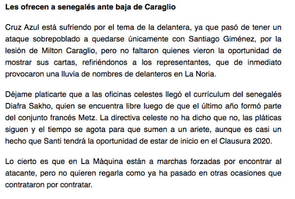 “Cruz Azul no alcanzó el monto de la operación, por lo que el futbolista ya no es opción para llegar a La Máquina. La suma era arriba de 8 millones. El futbolista ya negocia con otro equipo mexicano”, escribió el reportero Carlos Córdova através de su usuario de Twitter.