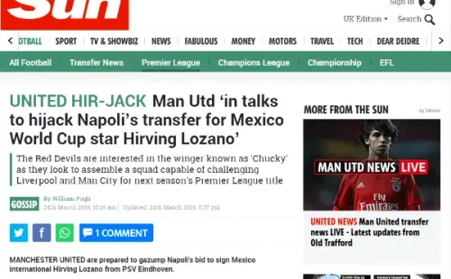 El diario británico The Sun, aclara que el conjunto que comanda Solskjær ya ha iniciado conversaciones con el agente de Lozano, Mino Raiola.