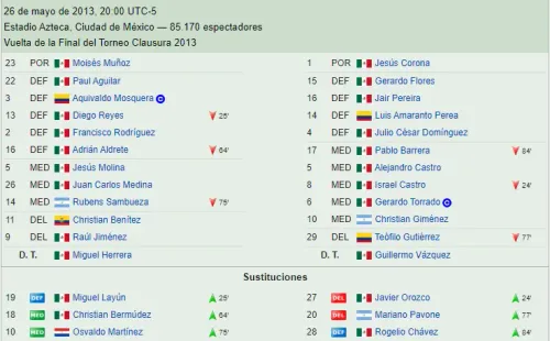 Aquel encuentro se disputó el 26de mayo de 2013 en el Estadio Azteca y fue victoria de América por 2a 1, igualando la serie tras perder 1-0 en la ida.