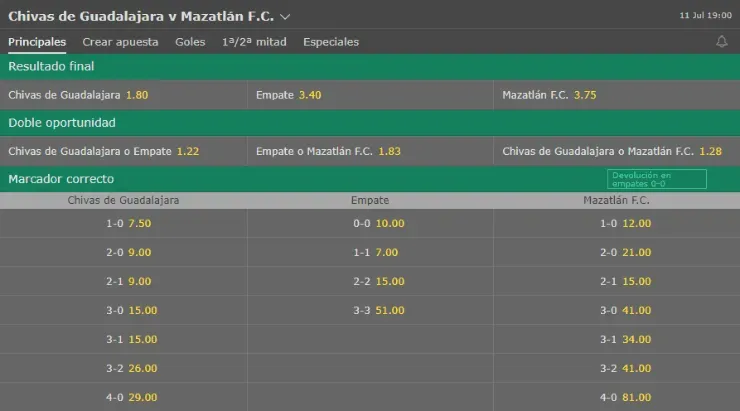 Por eso, en bet365 te contamos que el favorito para ganar son las Chivas de Guadalajara, que pagan 1,80 veces lo que juegues, en desmedro de los 3,75 del Mazatlán FC. Por si fuera poco, el momio del empate paga 3,40 veces lo que apuestes.