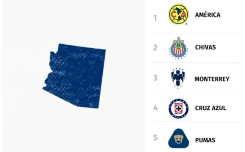 El equipo de Coapa fue el que mayor cantidad de búsquedas tuvo en este estado, incluyendo su capital, Phoenix. Sus 28 puntos de media lideran la tabla, seguidos por los 16 de Chivas. Monterrey se ubicó tercero con 8, Cruz Azul cuarto con 6 y Pumas quinto con 3.