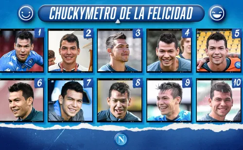 El ‘Chuckymetro‘ de la Felicidad muestra 10 de las mejores sonrisas del goleador mexicano para que los aficionados ‘azzurros‘ elijan la que mejor los identifique en el Día Internacional de la Felicidad, recordando, quizá, los 13 goles que ha firmado esta temporada con la camiseta napolitana.