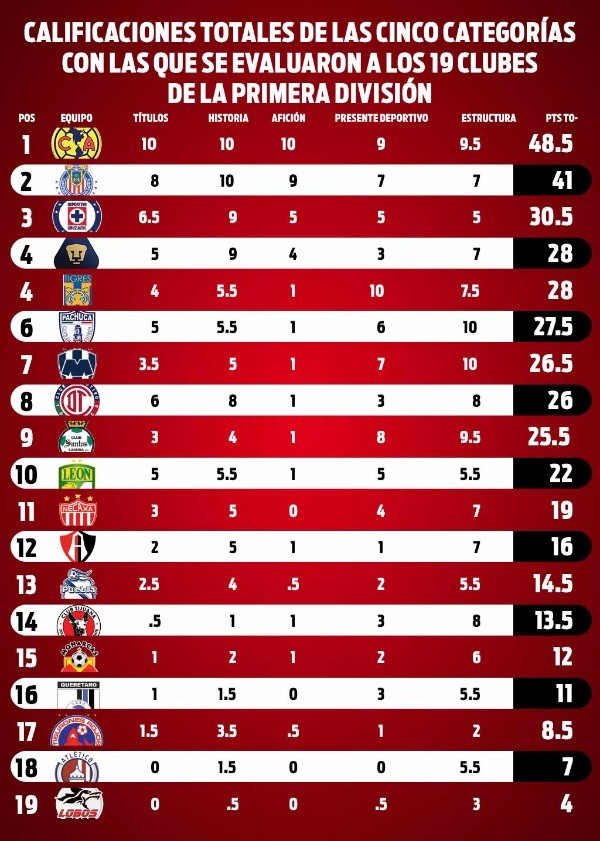 En ese orden, cada equipo recibió un puntaje en cada rubro y esto dio un puntaje final, que fue publicado hoy en el sitio. Los mismos fueron ubicados en orden, desde la escuadra con el número más alto hasta el más bajo.