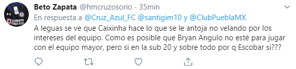 Esta noche el cuadro celeste enfrentará a Puebla por la Jornada 6 del Apertura 2019 de la Liga MX y se creía que Angulo podría estar en la banco, pero al haber sumado minutos con el equipo joven quedó descartado.