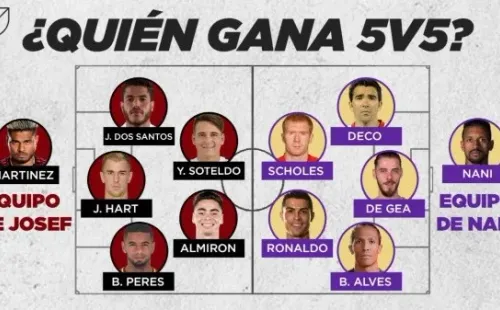 “El 5 ideal de Josef Martinez vs el 5 ideal de Luis Nani”, escribió la cuenta de la Major League en español, dejando ver a un mexicano entre los escogidos por el venezolano del Atlanta United: Jonathan Dos Santos, quien junto a Soteldo, Hart, Almirón y Péres conformó la escuadra que se mediría ante los seleccionados por el ex Manchester United.