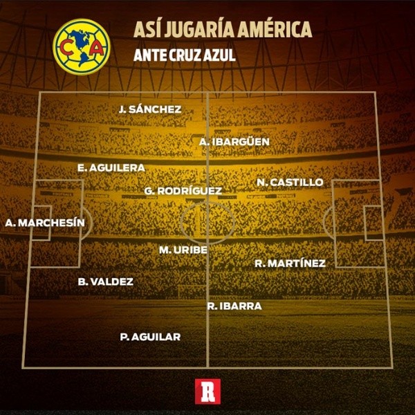 Los once futbolistas que saldrían a la cancha por el lado de losAzulcremasserían: Agustín Marchesín; Paul Aguilar, Bruno Valdez, Emanuel Aguilera, Jorge Sánchez; Renato Ibarra, Mateus Uribe, Guido Rodríguez, Andrés Ibargüen; Roger Martínez, Nicolás Castillo.