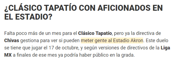 “La directiva de Chivas gestiona para ver si pueden meter gente al Estadio Akron. Esta semana habrá una reunión con autoridades sanitarias y de la FMF para comenzar protocolos de ingreso y aforo máximo permitido, entre otas cosas”, se pudo observar en la columna de Toque Filtrado, perteneciente a Mediotiempo.