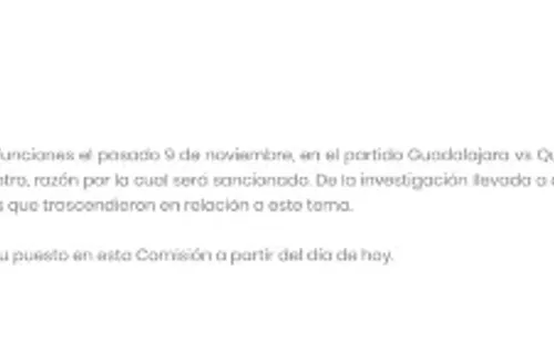 “El árbitro VAR Mauricio Morales fue sustituido de sus funciones el pasado de 9 de noviembre, en el partido Guadalajara vs Querétaro de la Jornada 18 de la Liga MX, por no haberse presentado a la junta de planeación previa al encuentro, razón por la cual será sancionado”, figura en el comunicado de la Comisión de Árbitros.