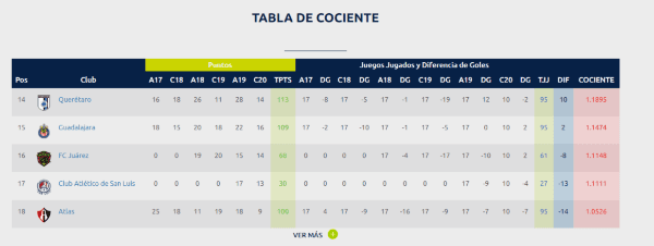 Por el momento Atlas ocupa el último lugar con un cociente de 1.0526, cerca está Atlético San Luis con1.111 y completa el podioJuárezcon 1.1148. Lo que sí, equipos como Chivas (1.1474) o Querétaro (1.1895)no se podrán descuidar.
