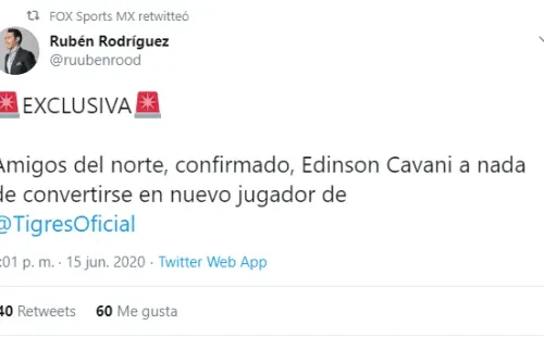 “EXCLUSIVA: Amigos del norte, confirmado, Edinson Cavani a nada de convertirse en nuevo jugador de Tigres”, escribió una cuenta falsa de Twitter que se hizo pasar por el reportero Rubén Rodríguez. ¿Por qué se le da tanta importancia a este mensaje? Porque Fox Sports MX cayó y le dio un retweet.