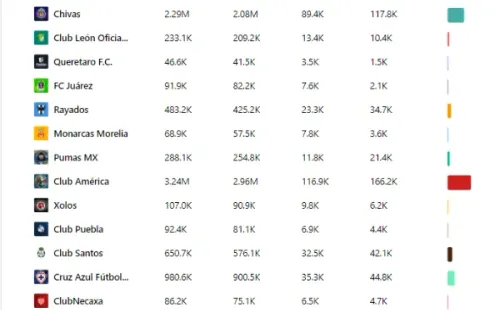 Chivas de Guadalajara lo sigue, aunque con 1 millón menos de interacciones (2.29M). Cruz Azul está tercero (980.6K), Tigres UANL cuarto (845.1K), Santos Laguna quinto (650.7K) y Rayados séptimo (483.2).