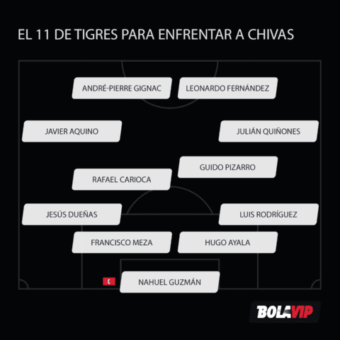 Tigres UANL formaría con: Nahuel Guzmán; Luis Rodríguez, Hugo Ayala, Francisco Meza, Jesús Dueñas; Guido Pizarro, Rafael Carioca; Julián Quiñones, Javier Aquino; André-Pierre Gignac, Leonardo Fernández. Salen: Carlos Salcedo, Diego Reyes, Luis Quiñones y Eduardo Vargas.