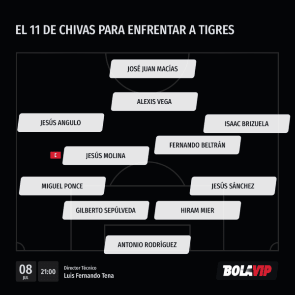 Chivas saldría con: Antonio Rodrígez; Jesús Sánchez, Hiram Mier, Gilberto Sepúlveda, Miguel Ponce; Fernando Beltrán, Jesús Molina; Isaac Brizuela, Alexis Vega, Jesús Angulo; José Juan Macías.