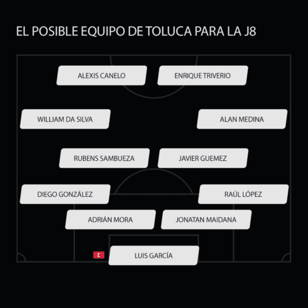 El posible equipo de Toluca: Luis García; Raúl López, Jonatan Maidana, Adrián Mora, Diego González; Alan Medina, Javier Guemez, Rubens Sambueza, William da Silva; Enrique Triverio, Alexis Canelo.