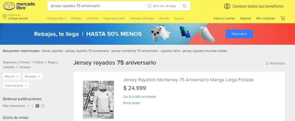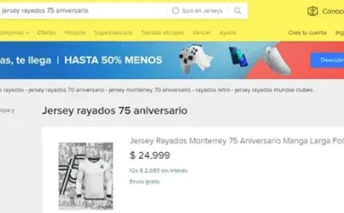 El aviso fue visualizado por seguidores del club regiomontano en la página Mercado Libre, bajo el anuncio: “Jersey Rayados Monterrey 75 Aniversarios Manga Larga Foliada”. Incluso figuran las cuotas sin interés con las que se podría efectuar la compra.