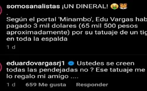 El chileno no se quedó callado y aclaró la situaciónen su cuenta de Instagram, donde también negó haber gastado dinero: “¿Ustedes se creen todas las pendejadas, no?Ese tatuaje me lo regaló mi amigo?”.