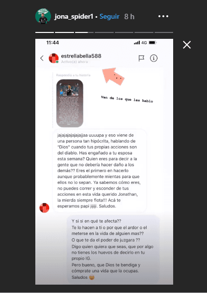 Posteriormente, un seguidor de usuario “estrellabella588” le respondió esta historia afirmando que esto es algo que vendría de una persona “hipócrita” y preguntándole si esta semana ha engañado a su esposa. El jugador no soportó dicho comentario, le respondió de forma tajante y la publicó en las redes sociales diciendo “¿ven de lo que les hablo?