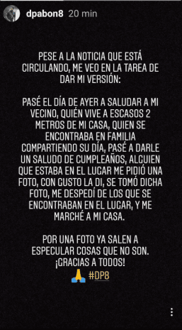 “Pasé el día de ayer a saludar a mi vecino, quien vive a escasos dos metros de mi casas, quien se encontraba en familia compartiendo su día. Pasé a darle un saludo de cumpleaños. Alguien que estaba en el lugar me pidió una foto, se la dí y luego me despedí para marcharme a casa“, expusó Pabón en una historia de su Instagram.