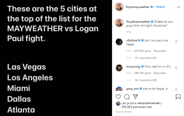 Esto lo sabe Floyd Mayweather que en febrero de este año había desestimado el choque contra con Logan Paul, pero que hoy comienza a ver con buenos ojos la pelea contra el hombre que forjó su carrera en YouTube. “¿Dónde creen que debería ser la pelea?”, expresó el exboxeador en su cuenta de Instagram con cinco posibles ciudades para llevar adelante la pelea.