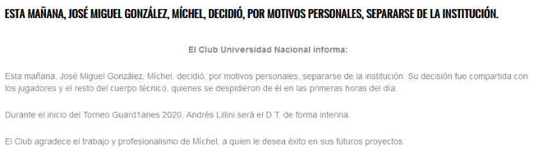 Este viernes, haciéndose eco de la abrupta partida del entrenador, el Francotirador de Récord publicó un artículo en el que detalló cómo fueron las últimas horas de Míchel al mando del Club Universidad. Aparentemente, el video de Miguel González publicado en las redes tuvo como único fin el hecho de generar el menor impacto posible.