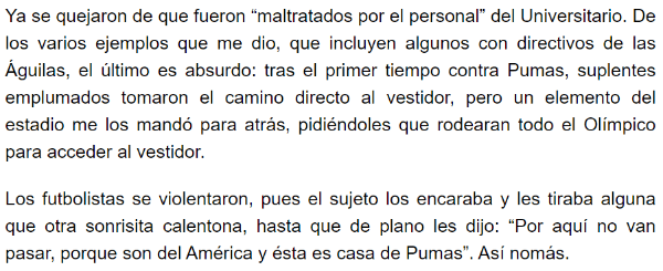 A su vez, el columnista del medio deportivo agregó: “Los futbolistas se violentaron, pues el sujeto los encaraba y les tiraba alguna que otra sonrisita calentona, hasta que de pronto les dijo: ‘Por aquí no van a pasar, porque son del América y ésta es casa de Pumas”.