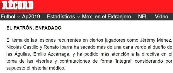 “El tema de las lesiones recurrentes en ciertos jugadores como Jérémy Ménez, Nicolás Castillo y Renato Ibarra ha sacado más de una cana verde al dueño de las Águilas“, anticipó la reconocido columna.