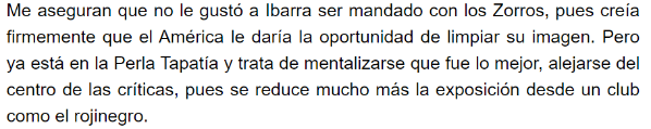 “Me aseguran que no le gustó a Ibarra ser mandado con los Zorros. Creía que finalmente el América le daría la oportunidad de limipar su imagen. Pero está en la Perla y trata de mentalizarse que fue lo mejor alejarse del centro de las crítcas”, reveló Francotirador de Récord.