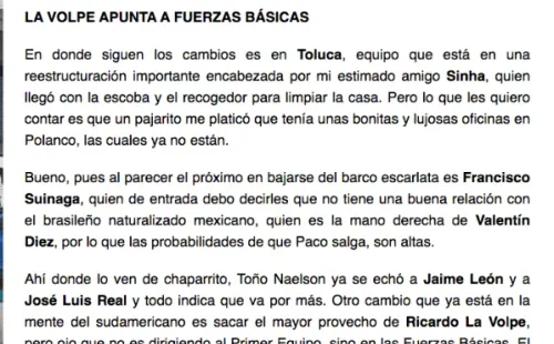 “Toño Naelson ya se echó aJaime Leóny aJosé Luis Realy todo indica que va por más. Otro cambio que ya está en la mente del sudamericano es sacar el mayor provecho deRicardo La Volpe, pero ojo que no es dirigiendo al Primer Equipo, sino en las Fuerzas Básicas. El Bigotón ya ha demostrado que sabe hacer muy bien las cosas detectando talento joven”, fue lo que escribió el Francotirador.