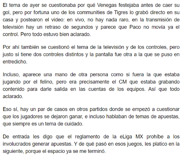 En su columna, el periodista dio aún más detalles: “Un día antes de cada juego hay una videollamada, organizada por la Liga MX, con los dos jugadores, un representante de cada club, un operativo del campeonato, que se encarga de coordinar la tecnología, y otro representante de las televisoras, que opera la transmisión”.