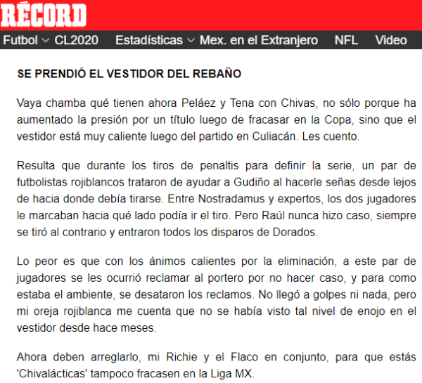 “Resulta que durante los tiros de penaltis para definir la serie, un par de futbolistas rojiblancos trataron de ayudar a Gudiño al hacerle señas desde lejos de hacia dónde debía tirarse. Entre Nostradamus y expertos, los dos jugadores le marcaban hacia qué lado podía ir el tiro. Pero Raúl nunca hizo caso”, comentó en primera instancia dicha columna de opinión.
