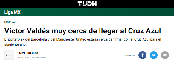 “Mundo Deportivo asegura que el arquero surgido en Barcelona está a un 90% de estampar su firma para engrosar las filas de los celestes. Víctor no tendría problema en firma con el Cruz Azul y llegar a la Liga MX, debido a que desde hace semanas está libre”, publicó dicho medio.