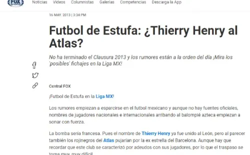 “La bomba sería francesa. Pues el nombre de Thierry Henry ya fue unido al León, pero al parecer también los rojinegros del Atlas pujarían por la ex estrella del Barcelona. Aunque hay que recordar que este club se caracterizó por adeudos con sus jugadores, por lo que el traspaso se torna muy, muy difícil”, reportaba Fox Sports sieteaños atrás.