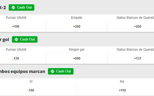 Para betway, el favorito para ganar este juego son las Pumas. Los de la UNAM pagan en el momio +100, por sobre los +250 que pagan los Gallos Blancos de Querétaro si crees que ellos ganarán. Ahora, el empate entre ambos también paga +250.