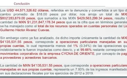 La Unidad de Inteligencia Financiera determinó, según lo comunicado, que el presidente de La Máquina “se ha manejado como el total de los recursos operados en las cuentas personales de Guillermo Álvarez Cuevas”.No obstante, el comunicado continúa: “Menos del 1% (0.34%) de las operaciones que indebidamente le fueron imputados como desvío, y el 99.66% restante corresponden a movimientos y corporativos de la empresaCycnade Oriente, por concepto de pago a proveedores y acreedores bancarios”.