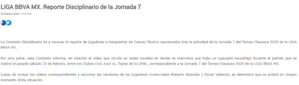 Con respecto al supuesto escupitajo de Roberto Alvarado sobre Enner Valencia en la victoria 2-1 de Cruz Azul sobre Tigres UANL, la FMF llegó a una resolución.