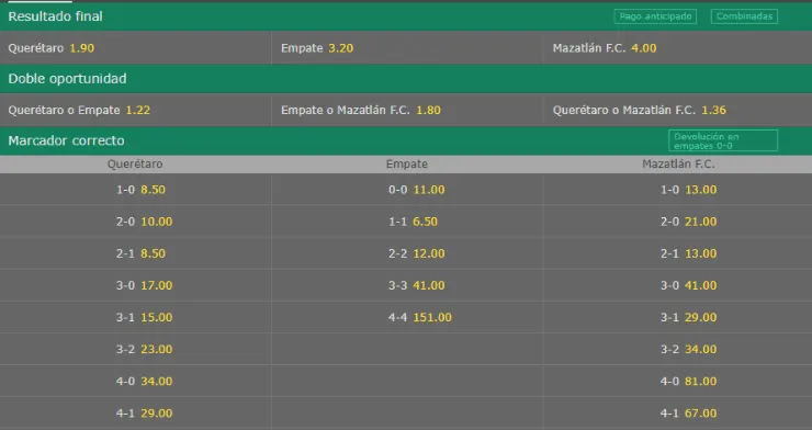 A media tarde, a las 17:00 hrs, Querétaro recibirá al debutante Mazatlán FC, quienes intentarán mejorar su imagen tras sus fallidas presentaciones en el inicio de la Liga MX tras la emergencia. Si tus fichas van hacia este juego, te contamos que bet365 tiene como favorito a los Gallos Blancos de Querétaro, que pagan 1,90 veces lo que juegues, sobre los 4,00 que paga Mazatalán. El empate, en tanto, paga 3,20 veces lo que apuestes.