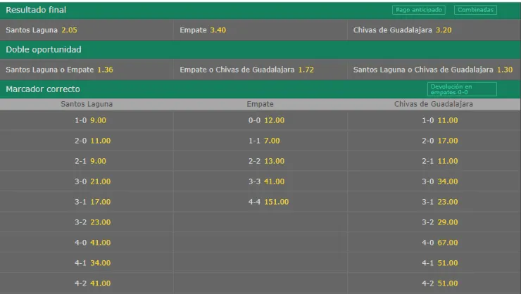 En el cierre de la jornada de domingo, a las 19:00 hrs, Santos Laguna recibirá a las Chivas de Guadalajara en el Estadio Corona, donde el Rebaño viene de empatar sin goles ante León, mientras que el cuadro local cayó por 2-0 ante Cruz Azul. Por eso, bet365 te cuenta que el favorito para ganar es el Santos Laguna, que paga 2,05 veces lo que juegues, por sobre los 3,20 de las Chivas. Ahora, si piensas que terminará en empate, el momio paga 3,40.