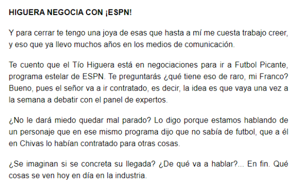 “Te cuento que el Tío Higuera está en negociaciones para ir a Futbol Picante, programa estelar de ESPN. Te preguntarás ¿qué tiene eso de raro, mi Franco? Bueno, pues el señor va a ir contratado, es decir, la idea es que vaya una vez a la semana a debatir con el panel de expertos”, escribió el columnista.