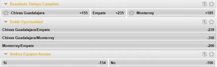 En Caliente.mx, el favorito para vencer en este juego de la Liga MX son las Chivas de Guadalajara, que pagan +155, contrario a los +185 que pagan los Rayados si creen que ellos serán los ganadores. En tanto, el empate paga +235.